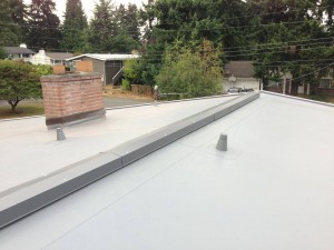 This is a PVC roof project located in Bellevue where we removed another failing Torchdown roof. All the plywood was replaced (due to improper ventilation), new fascia installed and finally a 50 mil PVC membrane by IB Roof Systems. Shown in gray. Tired of fighting seam failures; gooping tar and mastic? Call for your free estimate today! 206.919.3538.